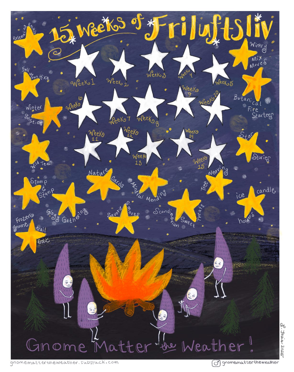 Thanks for being here for another winter with us! We love getting to know this community here and on Instagram via gnomemattertheweather or friluftslivingfamily We can’t wait to hear how you spend weeks 1-5 of “15 Weeks of Friluftsliv” and welcome winter.